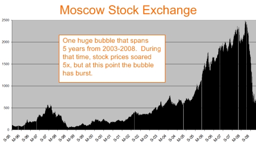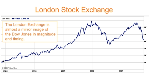 This post is called the Double Bubble, because it is clear that there have been two very significant bubbles to ripple through the world in the last 15 years. Just looking at the Dow Jones Industrial average, there is a bubble which begins circa 1995 and bottoms out circa 2003. Immediately after the tech bubble bottoms, a new bubble begins to form, which is the crisis we face today. As has already been discussed in previous blogs, Greenspan intentionally created a second bubble by lowering interest rates after the Tech Bubble popped.